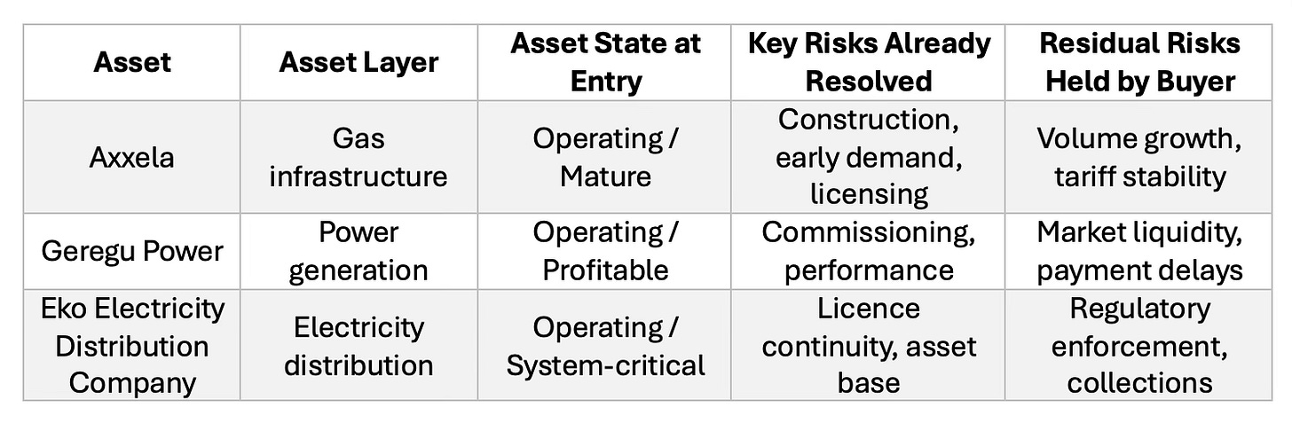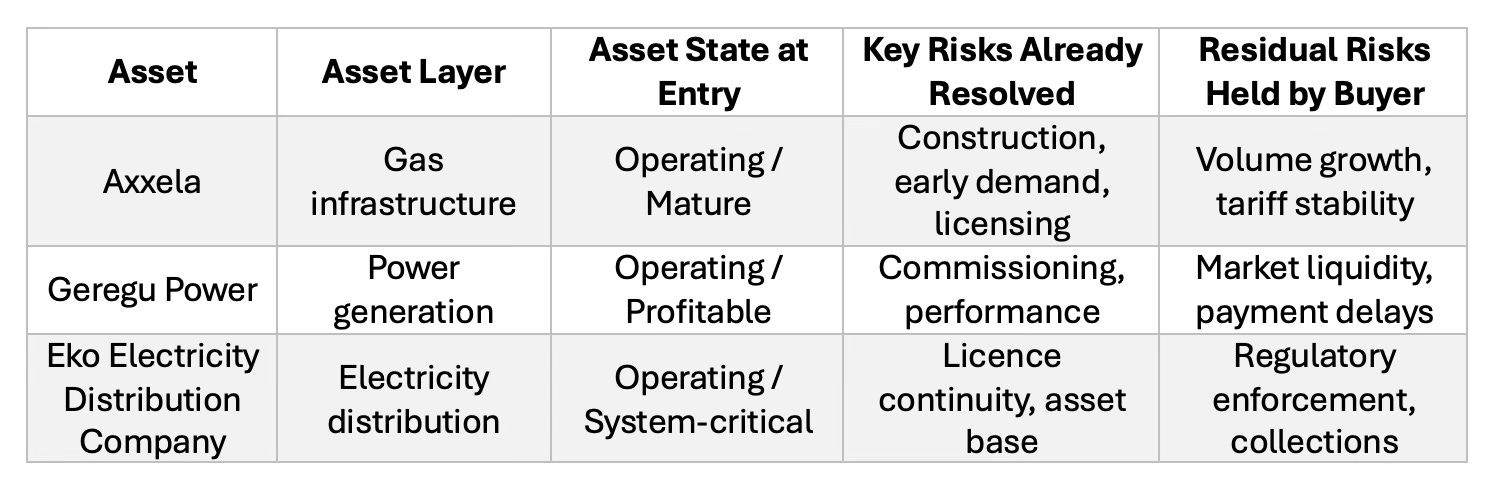 Across recent transactions, this positioning is expressed through the acquisition of control stakes in operating assets rather than the financing of new capacity. Recent ownership changes span mature gas infrastructure, established gas-fired generation, and electricity distribution, all already embedded within Nigeria’s energy system.